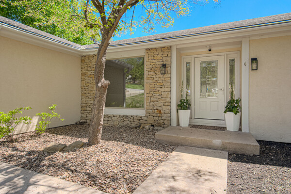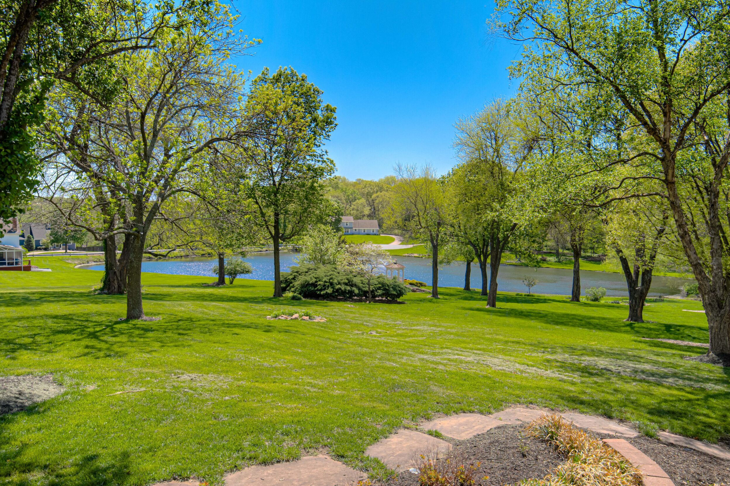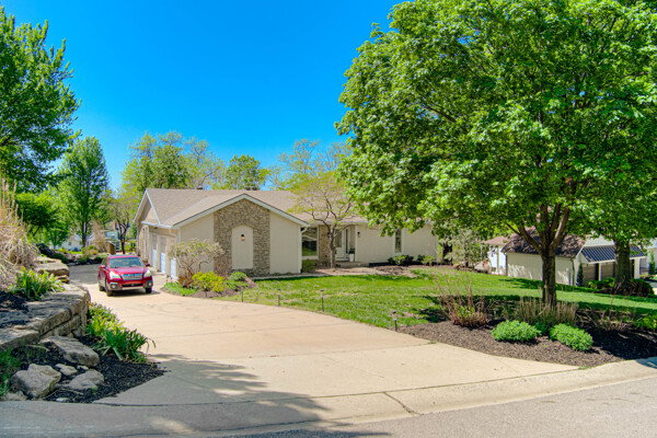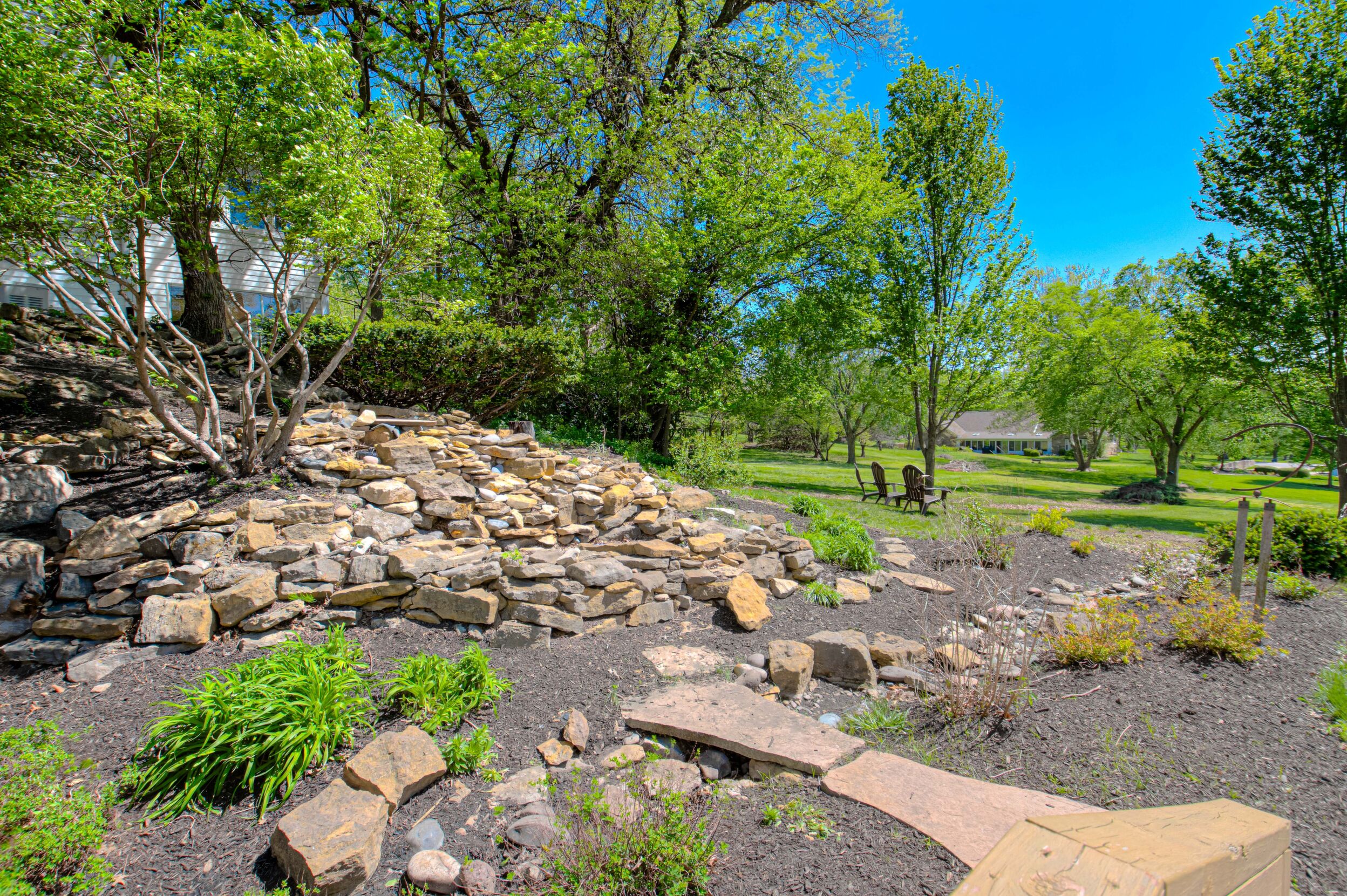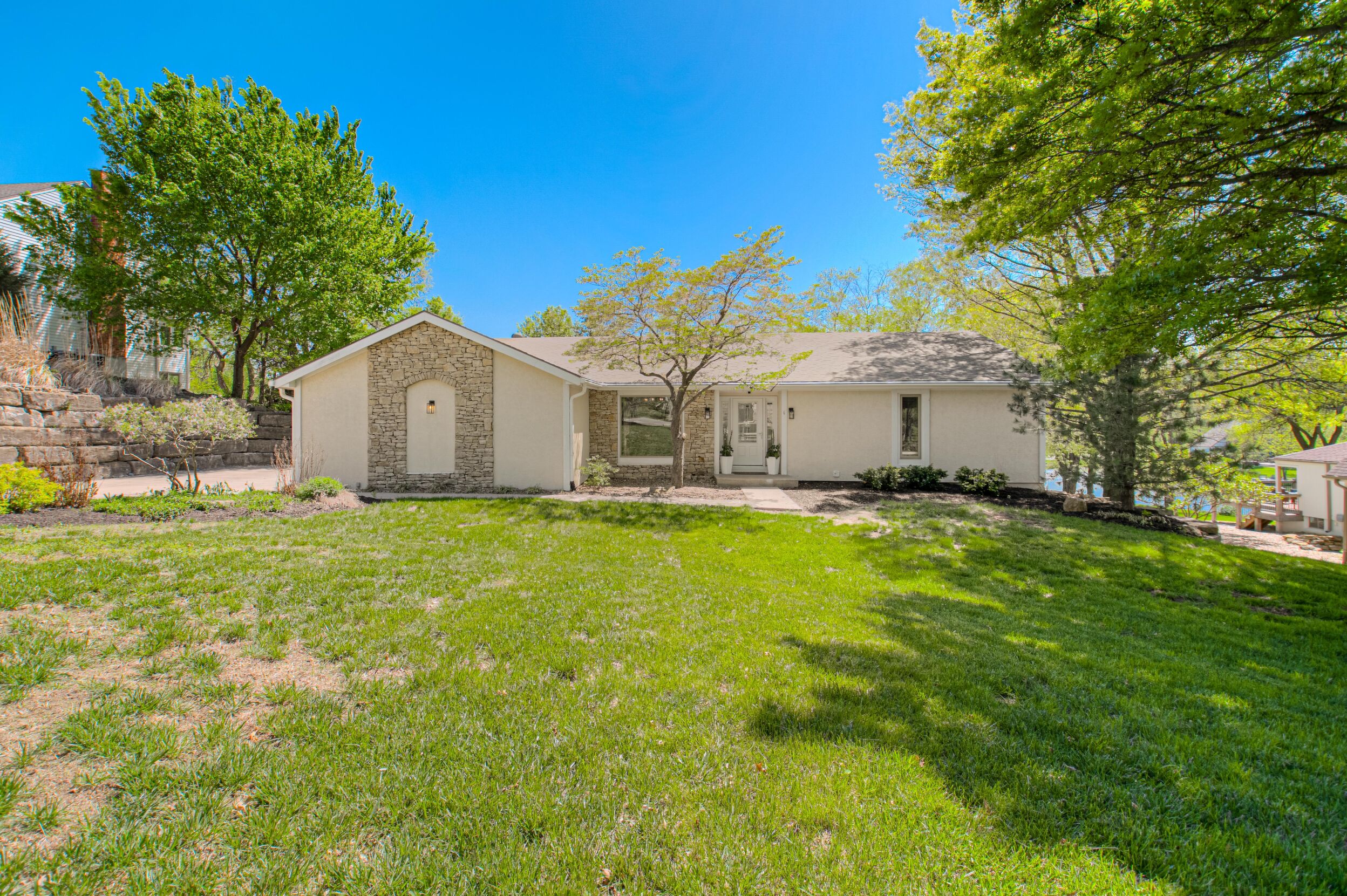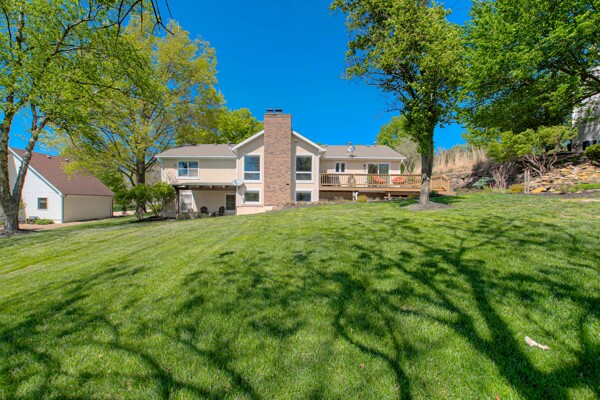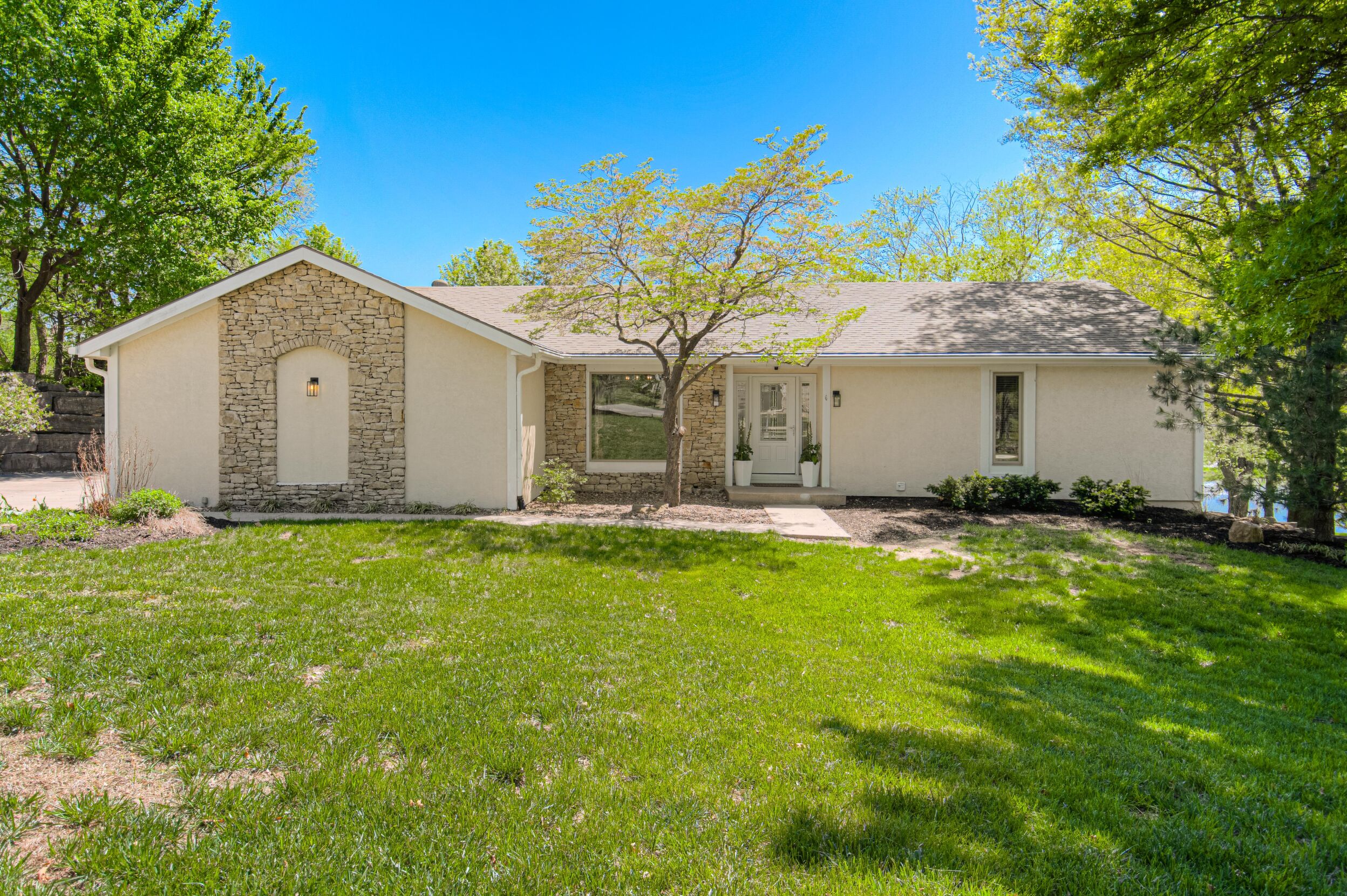 Nestled on a scenic 1-acre lot with peaceful water views, this beautifully maintained reverse 1.5-story home offers privacy, comfort, and a highly desirable location with no HOA and access to the acclaimed Blue Valley School District. Designed for convenience and flexibility, the main level features two bedrooms and two full bathrooms, including a spacious primary suite. The kitchen provides a casual dining area with tranquil backyard views and direct access to the deck-perfect for relaxing or entertaining. Nearby, a formal dining space and an inviting living room with a stone fireplace and hardwood flooring create a warm, welcoming atmosphere. A main-level laundry and pantry area adds everyday ease. The finished walk-out lower level expands the living space with a large recreation room, complete with a bar and second fireplace. Two additional bedrooms, a full bathroom, and a second laundry area offer excellent options for guests or extended living arrangements. Step outside to a covered patio and enjoy the natural surroundings. The property's outdoor setting is a standout feature, showcasing mature landscaping, a waterfall element, flagstone pathways, and frequent wildlife sightings, all set against a peaceful water backdrop. Despite its private feel, the home is conveniently located near shopping, dining, entertainment, and medical facilities at BluHawk. Additional highlights include a whole-house generator, updated 200-amp electrical service, newer roof (approximately 7 years), gutter guards (approximately 3 years), updated deck, replacement windows (Pella and Andersen), upgraded Onyx bathrooms, side-entry garage, and hard surface countertops. Interior and Aerial photos coming soon.