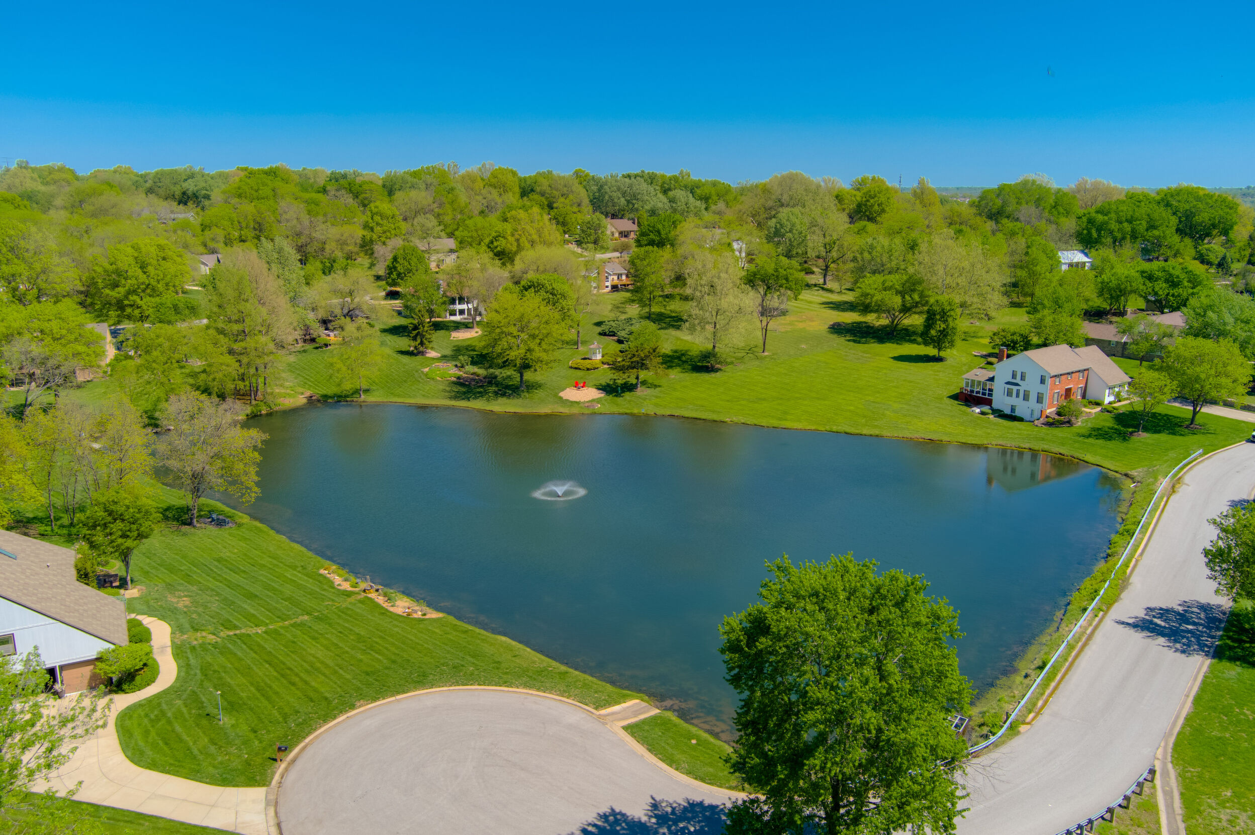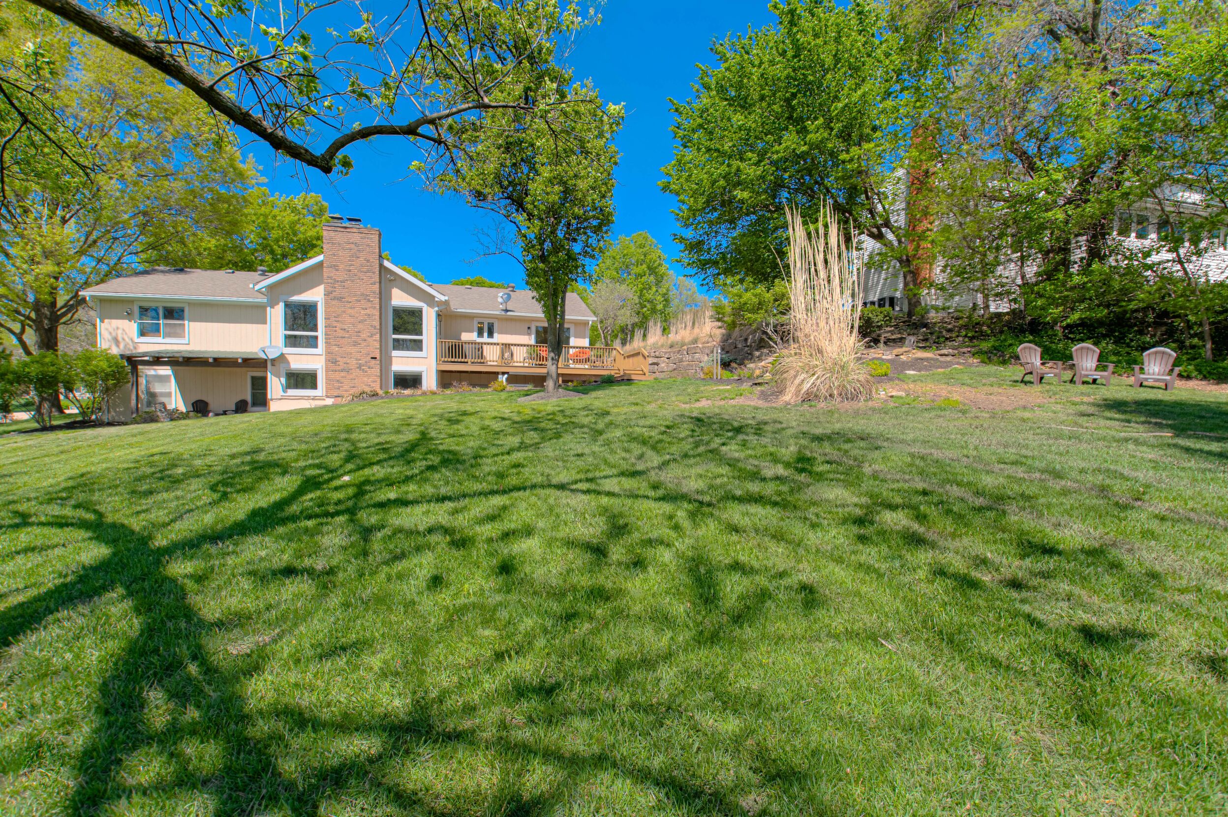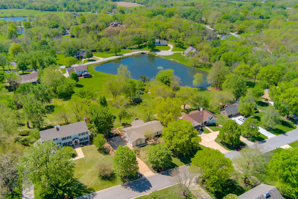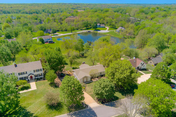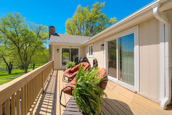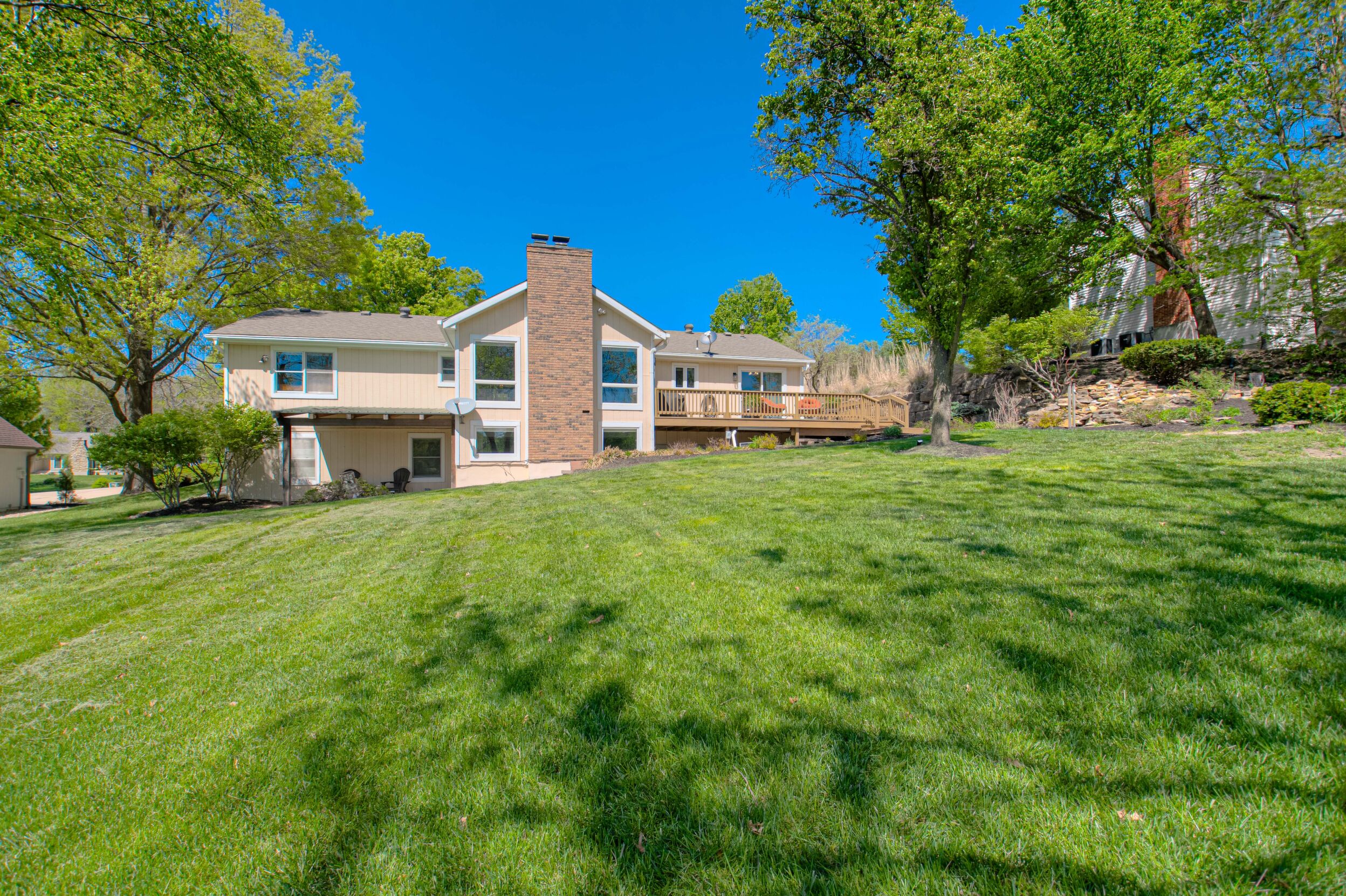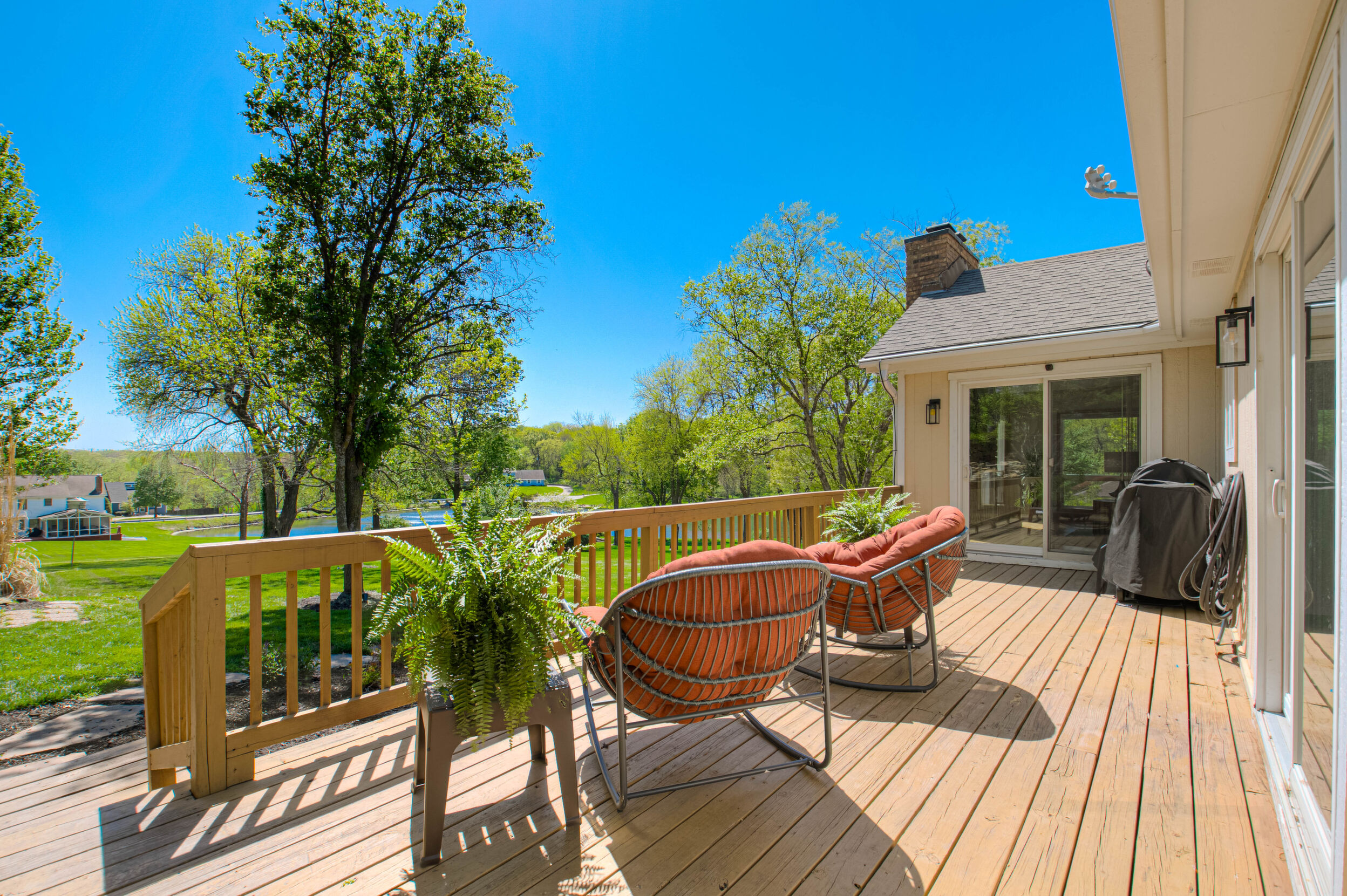 Nestled on a scenic 1-acre lot with peaceful water views, this beautifully maintained reverse 1.5-story home offers privacy, comfort, and a highly desirable location with no HOA and access to the acclaimed Blue Valley School District. Designed for convenience and flexibility, the main level features two bedrooms and two full bathrooms, including a spacious primary suite. The kitchen provides a casual dining area with tranquil backyard views and direct access to the deck-perfect for relaxing or entertaining. Nearby, a formal dining space and an inviting living room with a stone fireplace and hardwood flooring create a warm, welcoming atmosphere. A main-level laundry and pantry area adds everyday ease. The finished walk-out lower level expands the living space with a large recreation room, complete with a bar and second fireplace. Two additional bedrooms, a full bathroom, and a second laundry area offer excellent options for guests or extended living arrangements. Step outside to a covered patio and enjoy the natural surroundings. The property's outdoor setting is a standout feature, showcasing mature landscaping, a waterfall element, flagstone pathways, and frequent wildlife sightings, all set against a peaceful water backdrop. Despite its private feel, the home is conveniently located near shopping, dining, entertainment, and medical facilities at BluHawk. Additional highlights include a whole-house generator, updated 200-amp electrical service, newer roof (approximately 7 years), gutter guards (approximately 3 years), updated deck, replacement windows (Pella and Andersen), upgraded Onyx bathrooms, side-entry garage, and hard surface countertops. Interior and Aerial photos coming soon.