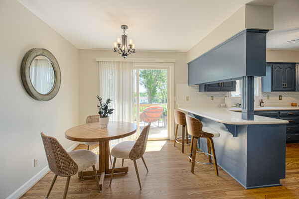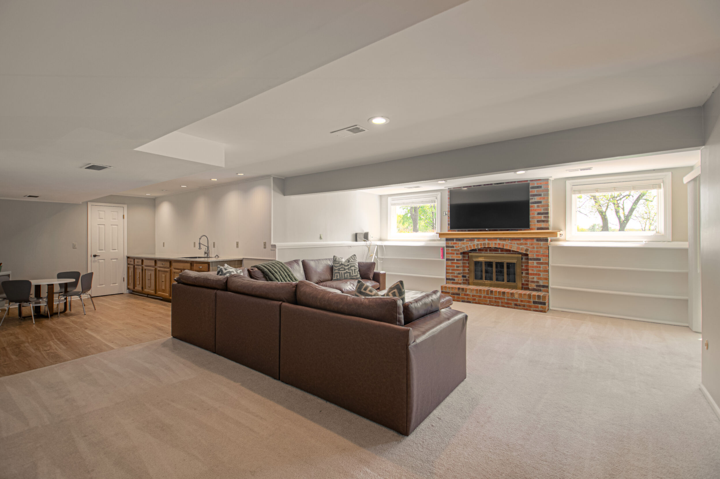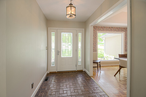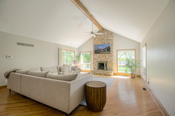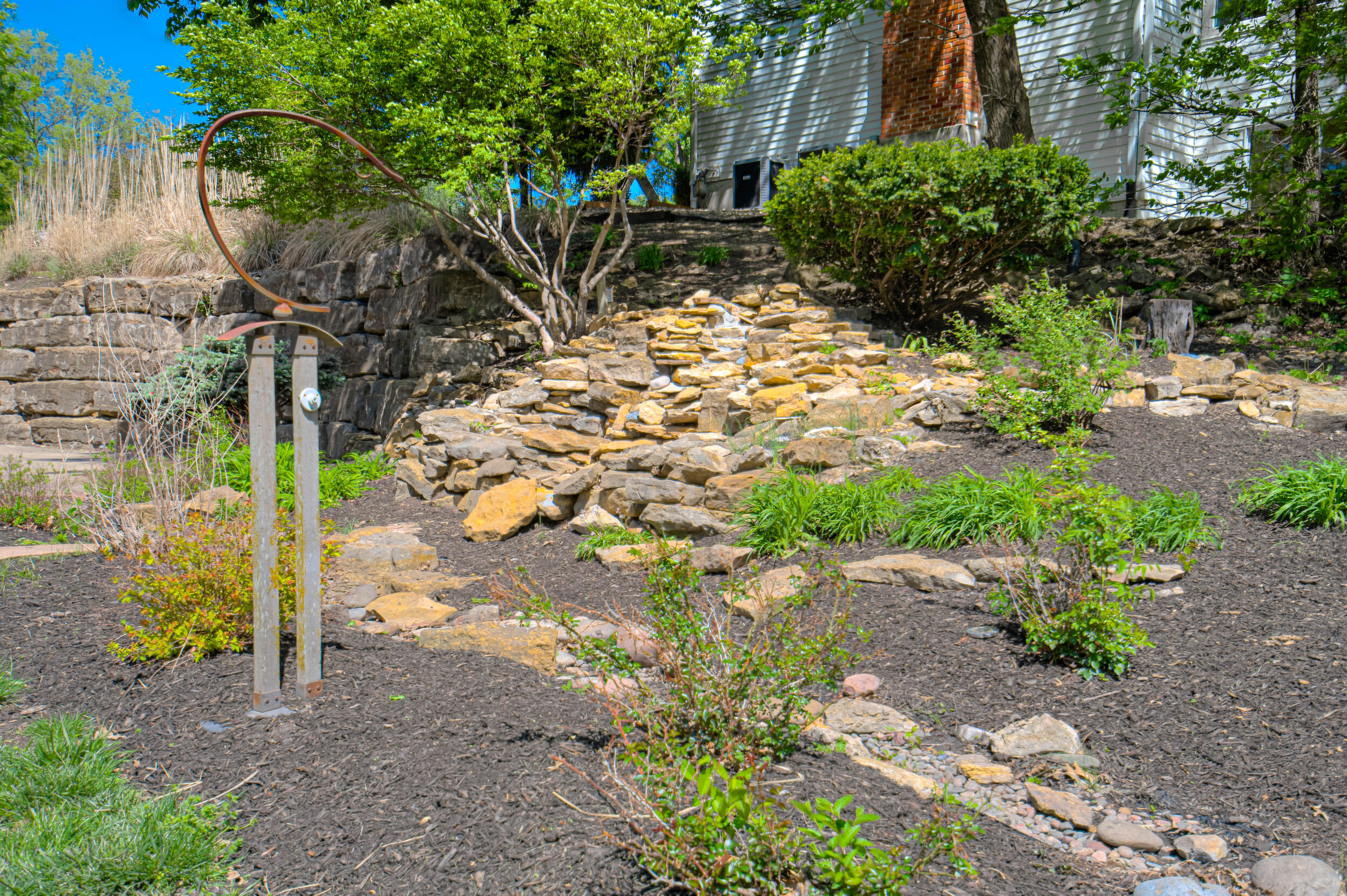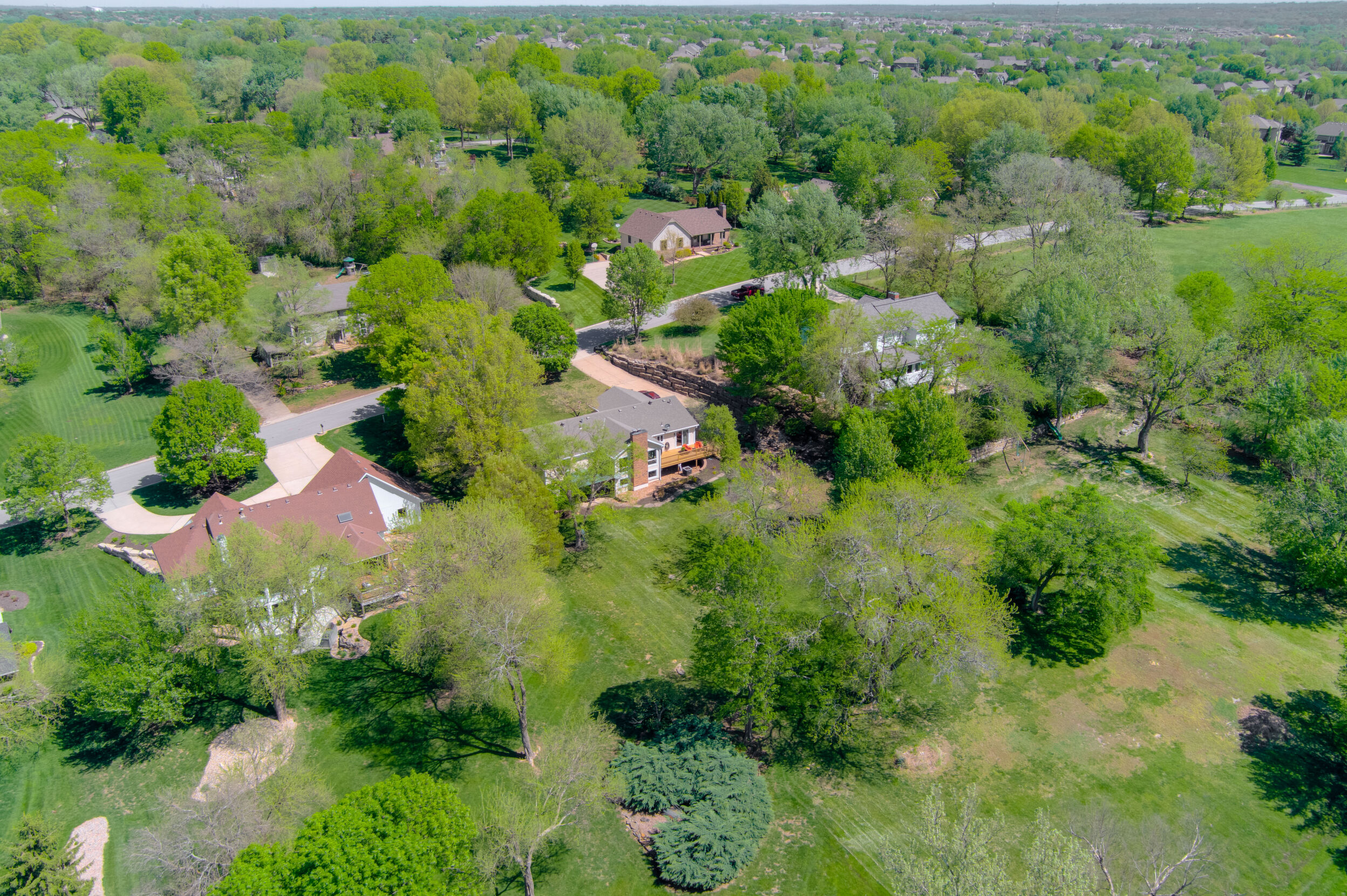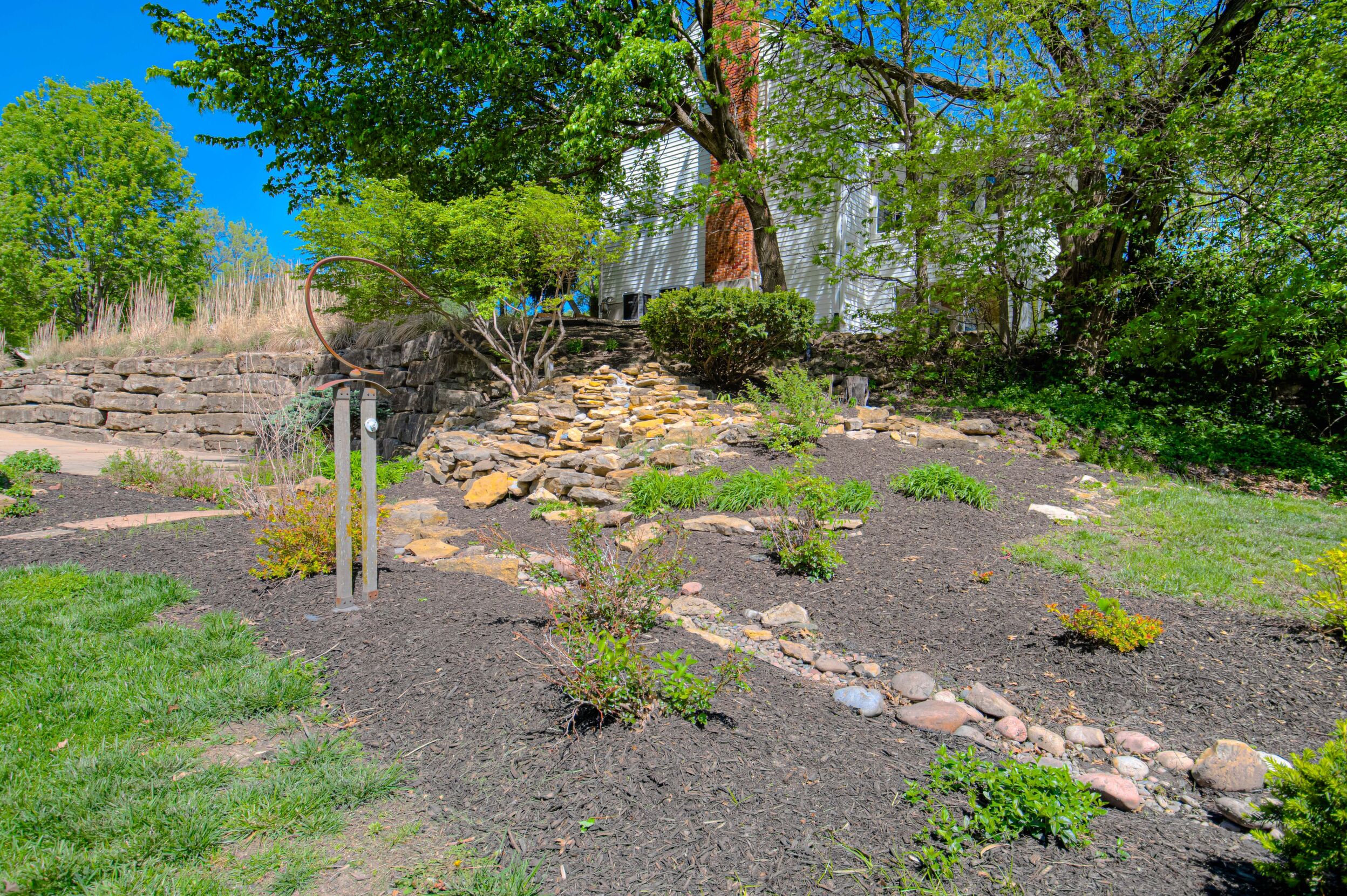 Nestled on a scenic 1-acre lot with peaceful water views, this beautifully maintained reverse 1.5-story home offers privacy, comfort, and a highly desirable location with no HOA and access to the acclaimed Blue Valley School District. Designed for convenience and flexibility, the main level features two bedrooms and two full bathrooms, including a spacious primary suite. The kitchen provides a casual dining area with tranquil backyard views and direct access to the deck-perfect for relaxing or entertaining. Nearby, a formal dining space and an inviting living room with a stone fireplace and hardwood flooring create a warm, welcoming atmosphere. A main-level laundry and pantry area adds everyday ease. The finished walk-out lower level expands the living space with a large recreation room, complete with a bar and second fireplace. Two additional bedrooms, a full bathroom, and a second laundry area offer excellent options for guests or extended living arrangements. Step outside to a covered patio and enjoy the natural surroundings. The property's outdoor setting is a standout feature, showcasing mature landscaping, a waterfall element, flagstone pathways, and frequent wildlife sightings, all set against a peaceful water backdrop. Despite its private feel, the home is conveniently located near shopping, dining, entertainment, and medical facilities at BluHawk. Additional highlights include a whole-house generator, updated 200-amp electrical service, newer roof (approximately 7 years), gutter guards (approximately 3 years), updated deck, replacement windows (Pella and Andersen), upgraded Onyx bathrooms, side-entry garage, and hard surface countertops. Interior and Aerial photos coming soon.
